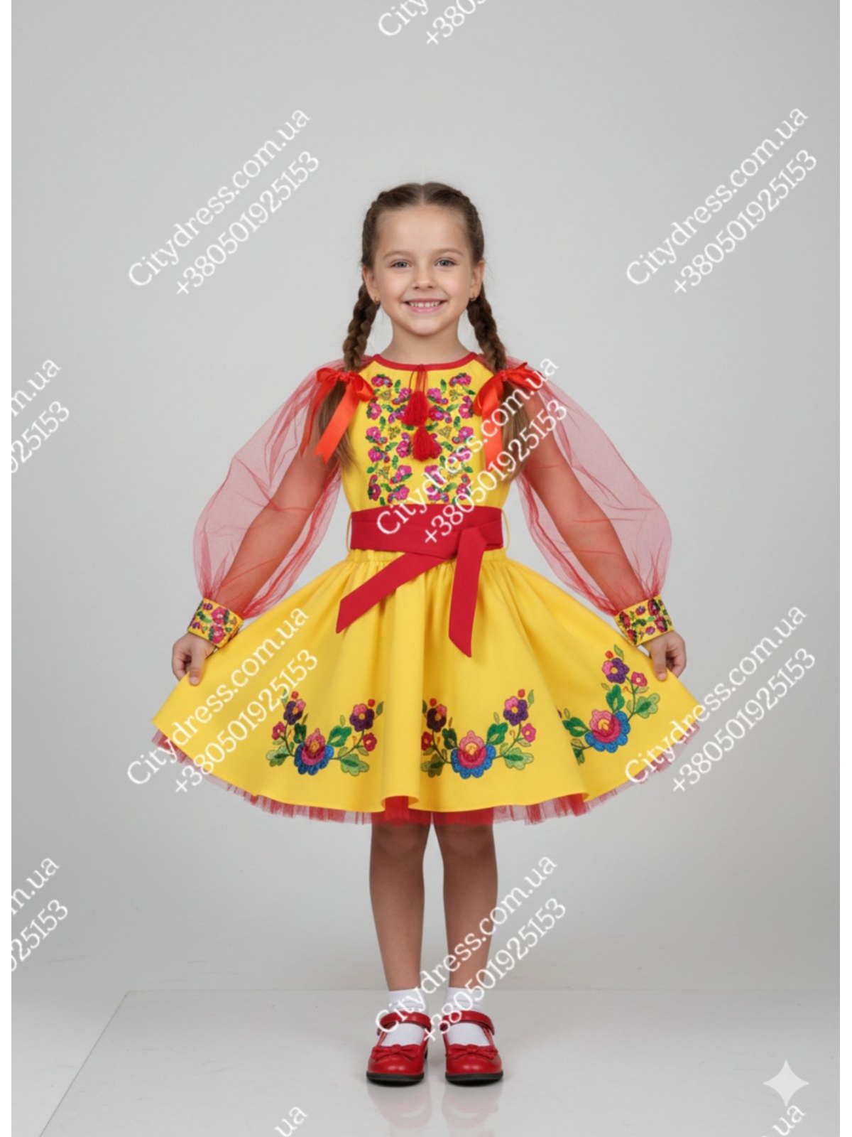 Вишуканий український костюм для дівчаток, що поєднує традиційний стиль із сучасним дизайном. Пишна спідниця "сонце-кльош" з ефектним об'ємом завдяки фатіновому під'юбнику створює казковий силует, а вишивка по колу надає костюму автентичності й яскравості.