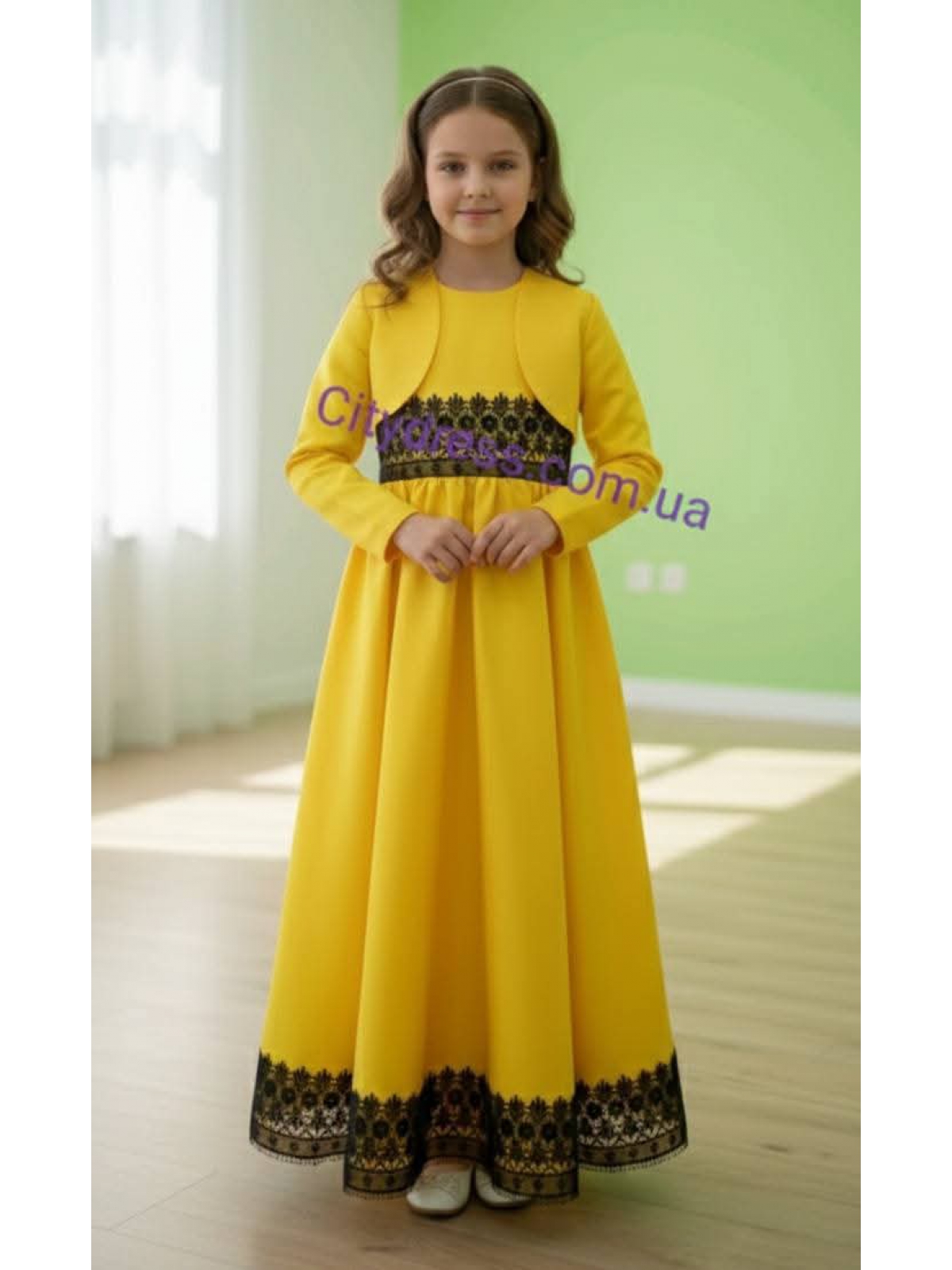 Дитяча сукня, корсет без шнурівки , тільки блискавка, колір жовтий з чорним мереживом.